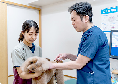 犬、猫の外科、内科、皮膚科、眼科など全般を診療しております。大型犬も承ります。小動物に関しては、うさぎ、ハムスター、モルモットの内科診療のみ行っております。